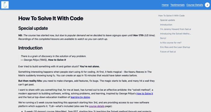 }I can see a webpage for “How To Solve It With Code” - a course by Jeremy Howard. The page shows a special update noting that signups are open until Nov 17th, and includes an introduction section with a George Pólya quote about problem-solving. The page discusses using AI for coding and introduces the “solveit method” inspired by Pólya’s work and fast.ai’s learning-by-doing approach. There’s a navigation menu on the right showing various course sections.