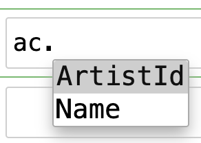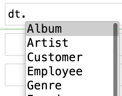 ArtistId: int | None = UNSETBecause dataclass() is dynamic, you won’t get auto-complete in editors like vscode – it’ll only work in dynamic environments like Jupyter and IPython. For editor support, you can export the full set of dataclasses to a module, which you can then import from: